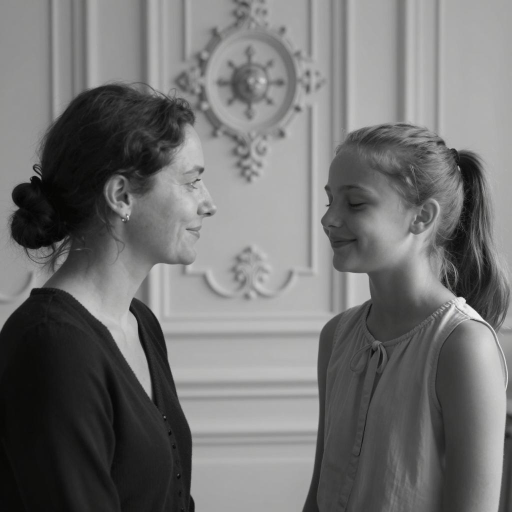Black and white photograph depicting a tense moment between three people. A bald man in a light shirt leans forward with an intense gaze directed at a woman with dark curly hair wearing a striped sleeveless top. Between them sits a young girl with long hair in a sleeveless sundress, looking forward with a neutral expression. The setting features a softly lit interior with decorative wall molding.