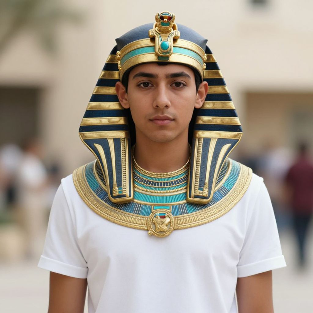 Photograph of a young Indigenous man with medium brown skin, wearing a detailed, colorful feather headdress and elaborate necklaces, standing shirtless in a