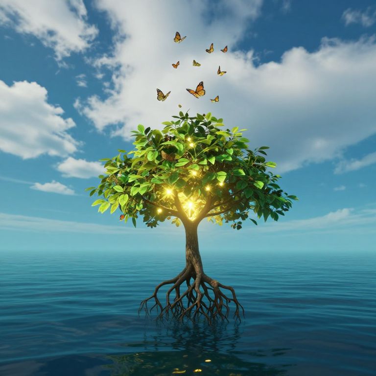 Photograph-like digital artwork of a vibrant, green-leaved tree rooted in calm, deep blue ocean water. Bright sunlight beams through the tree's canopy, illuminating golden-yellow light and attracting a swarm of orange and black butterflies that flutter around. The sky is a rich blue with scattered white clouds. The tree's roots are visible, extending downward into the water, creating a surreal, magical atmosphere. The overall scene is serene and enchanting, blending natural elements with a fantastical touch.