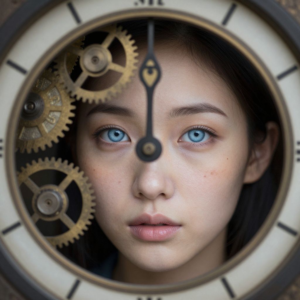 Envision an ultra-realistic DSLR portrait of an East Asian woman with striking icy blue eyes, captured from a unique overhead perspective akin to peering through a timepiece's lens. This angle reveals intricate details like delicate freckles and a subtle birthmark on her fair skin. The background showcases an elaborate clockwork mechanism, featuring gears, cogs, and pendulums seamlessly integrated into the composition. Together, these elements create an emotional gradient that evokes timelessness and introspection, perfectly reflected in her serene yet enigmatic expression.