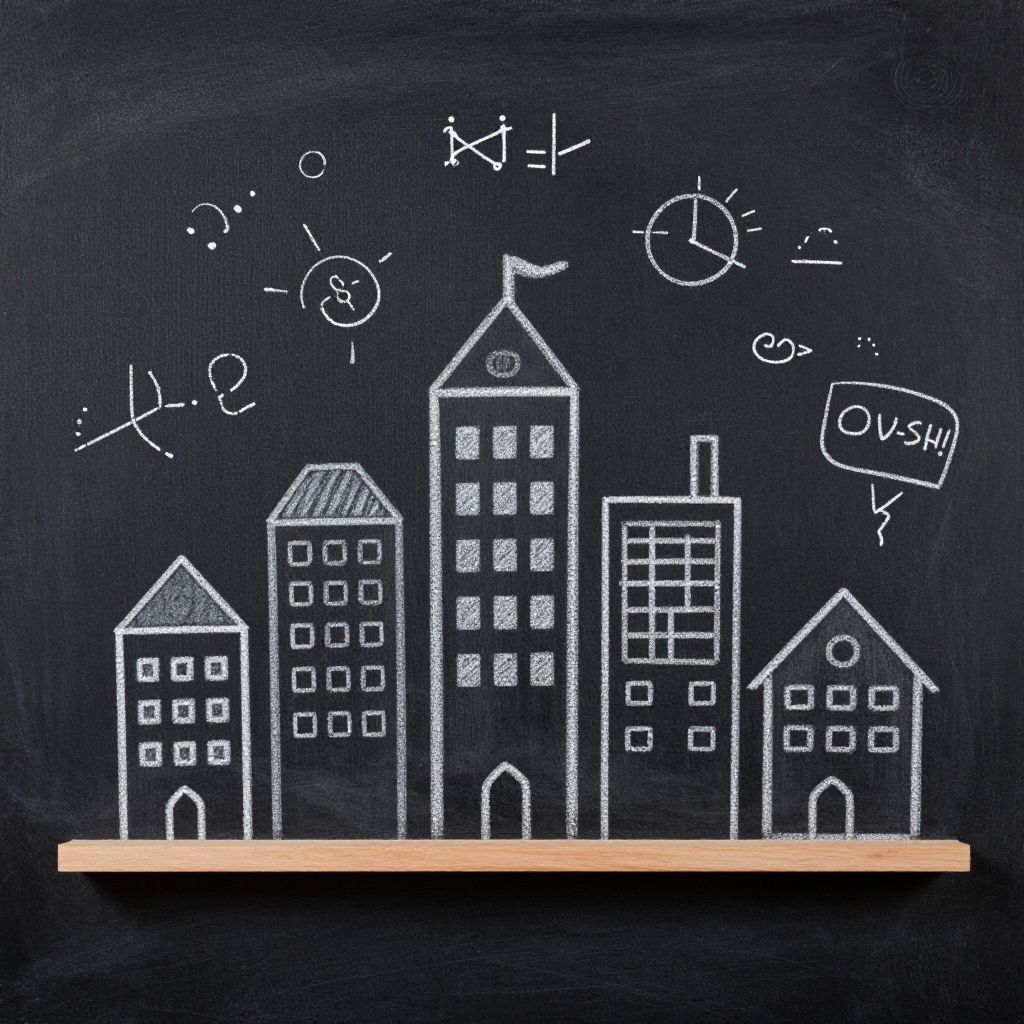 This image is a digital chalk drawing on a blackboard-style background. It depicts a row of five white, chalk-drawn buildings of varying heights with rectangular windows. The tallest building is in the center, flanked by shorter buildings on either side. Above the buildings, white mathematical and scientific chalk drawings include equations, a sun with rays, a clock, and a speech bubble with an exclamation mark. The blackboard background has a textured, chalky appearance, and a thin horizontal chalk line at the bottom separates the buildings from the background.