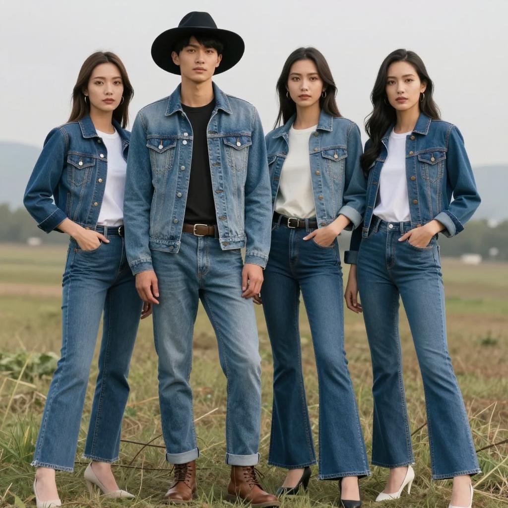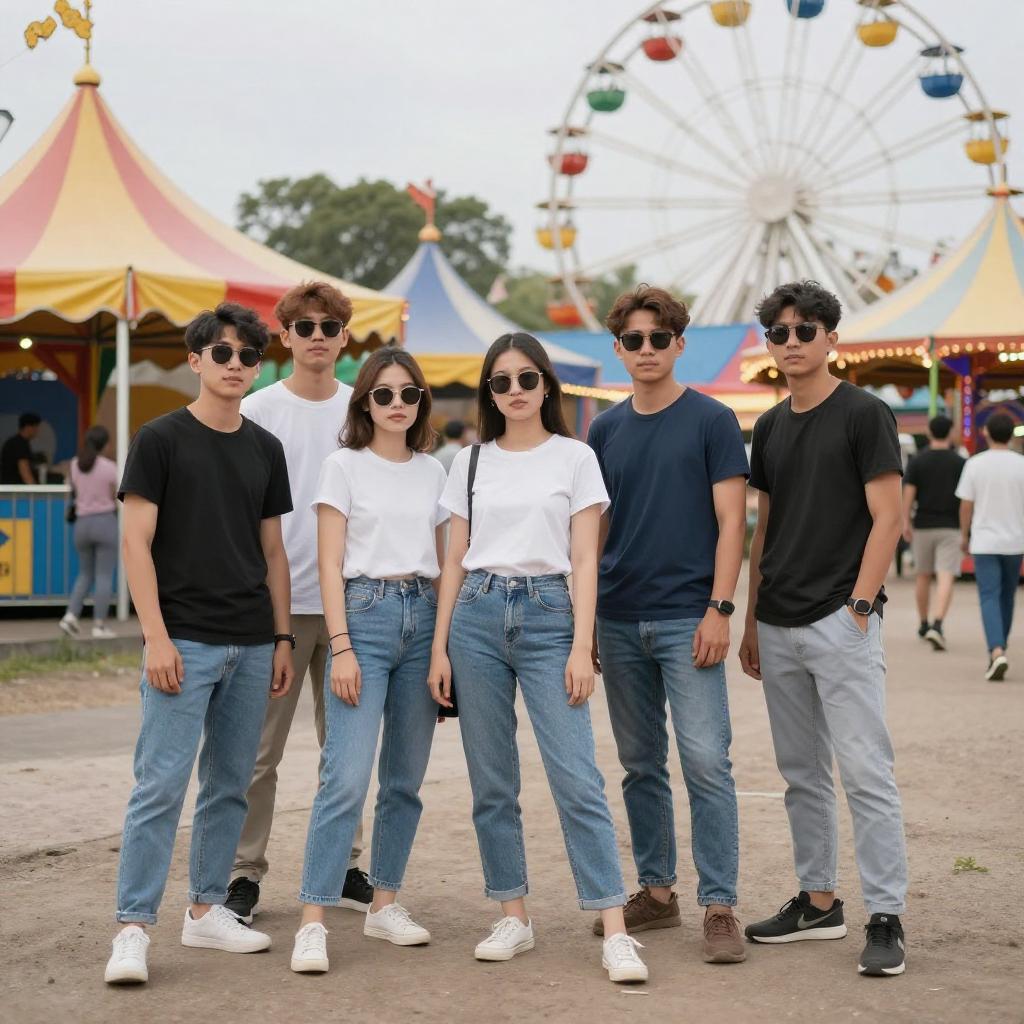 A group of six young adults, five men and one woman, casually dressed in jeans and t-shirts with sunglasses, posing together at an outdoor carnival or amusement park. Colorful tents and a ferris wheel are visible in the background, indicating a festive and lively atmosphere.