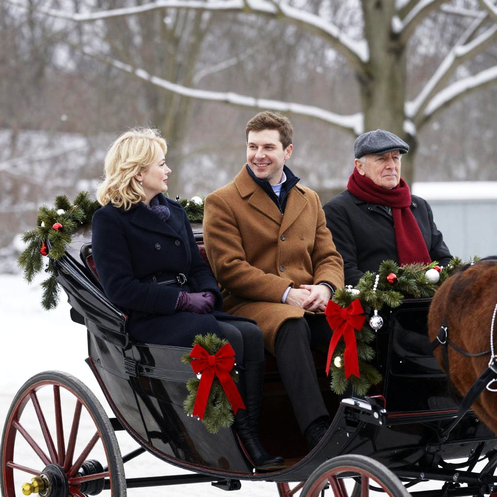 Photograph of three people seated in a black horse-drawn carriage decorated with greenery, red bows, and Christmas ornaments. The middle-aged man in the center is wearing a brown coat and smiling. A blonde woman in a dark blue coat and purple gloves looks at him, while an older man with a gray flat cap and red scarf gazes ahead. The setting is snowy with bare trees in the background, evoking a festive winter atmosphere.