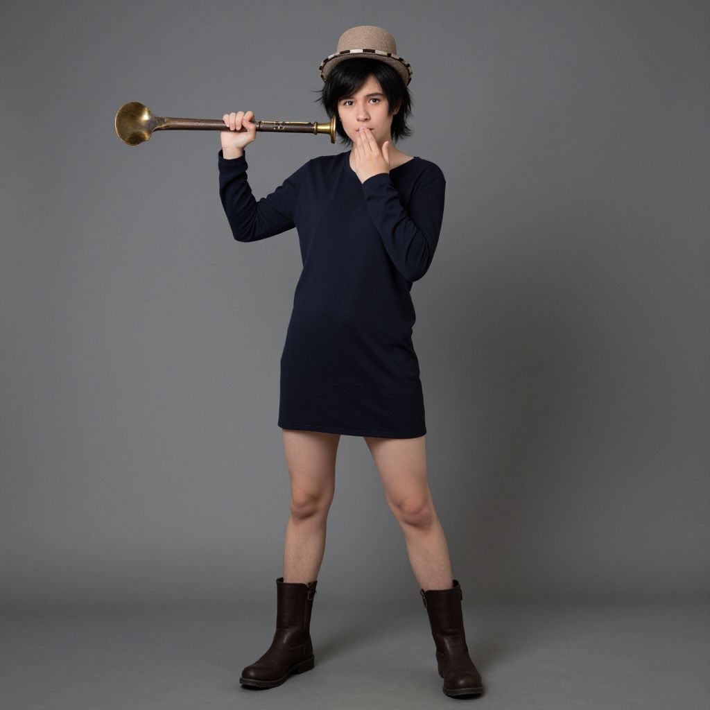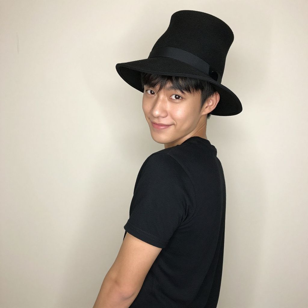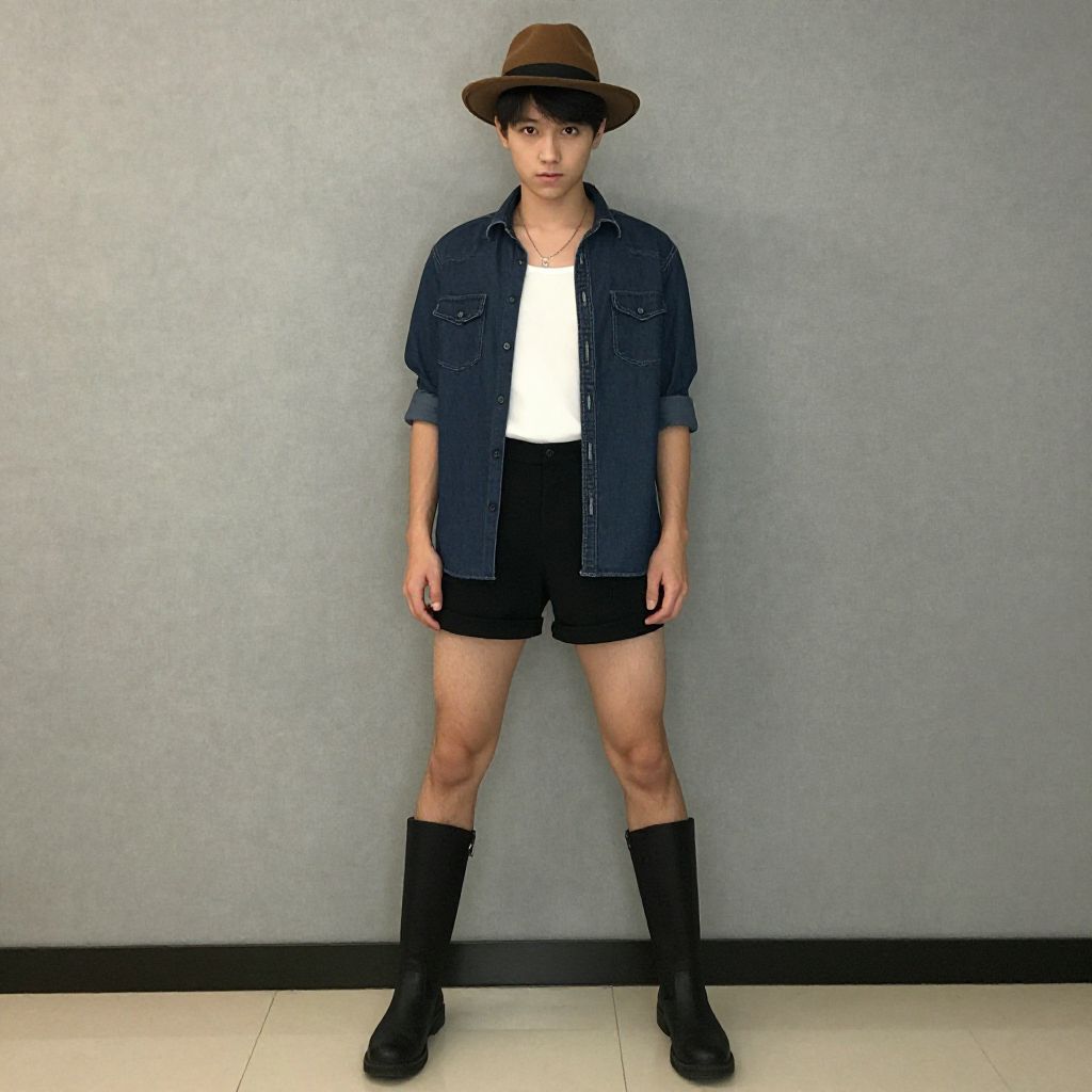 "that show costume, 1boy, solo, male focus, hat, standing, indoors, full body, boots Realistic photo of casual sexy person with pretty face"