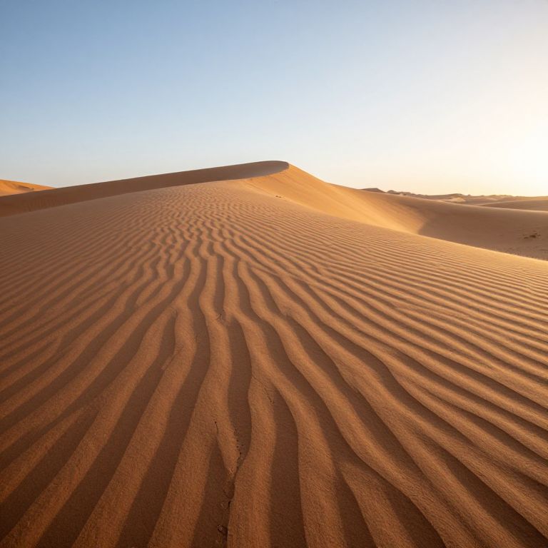Photograph of a desert landscape at sunset, featuring rippled sand dunes with warm orange and brown hues under a clear blue sky.