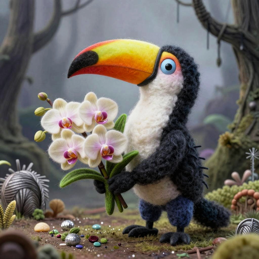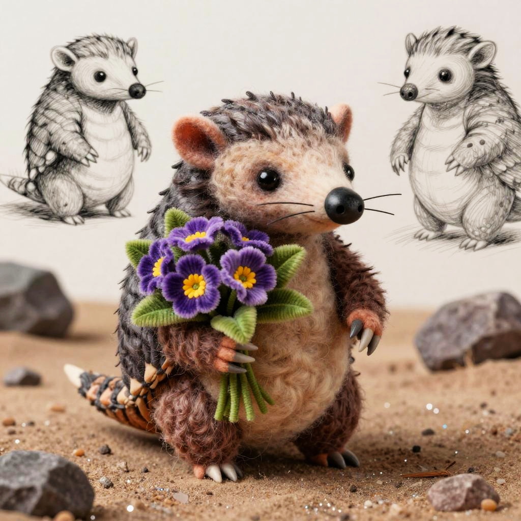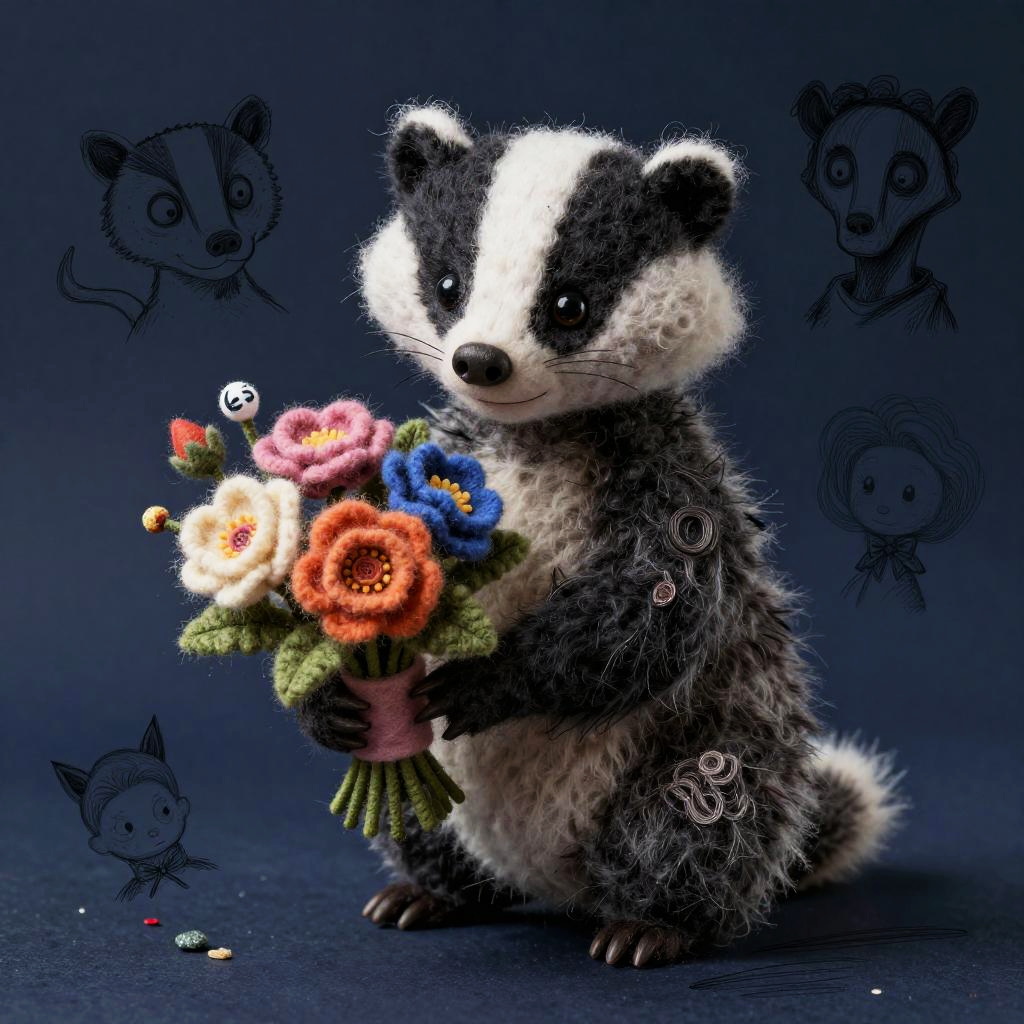 A funny cartoon ferret with a bouquet of crystalline snowdrops in the style of Tim Burton, in a mixed style of volumetric ink + felting effect of wool felting. Super-detailed image with photorealism and sketching effect. Interesting 3D doodling frosty glade interspersed with glitter crumbs.