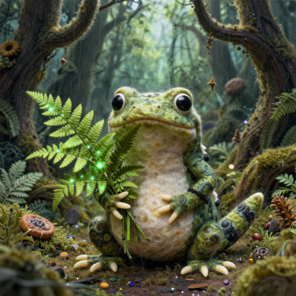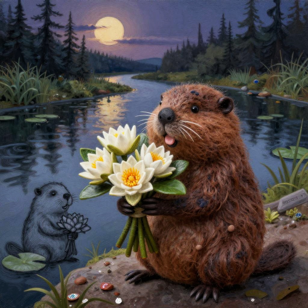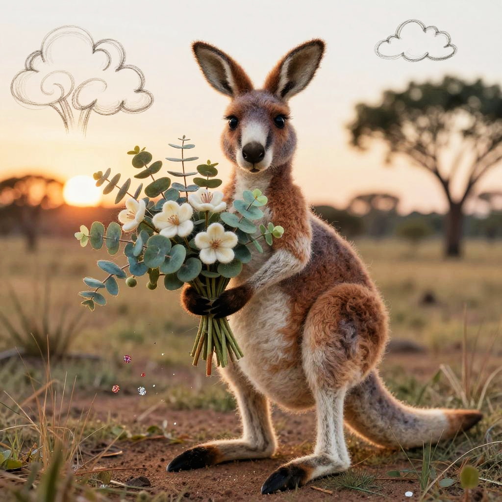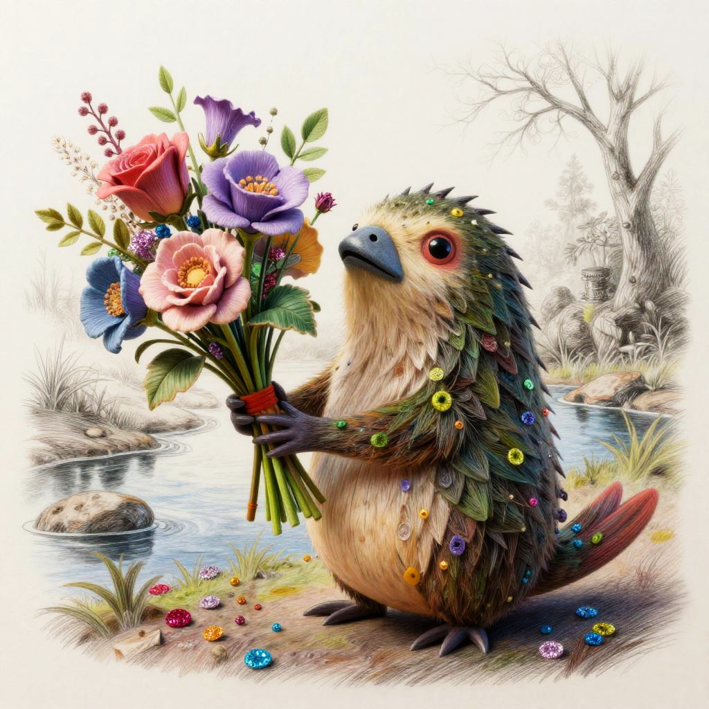 A funny cartoon ferret with a bouquet of crystalline snowdrops in the style of Tim Burton, in a mixed style of volumetric ink + felting effect of wool felting. Super-detailed image with photorealism and sketching effect. Interesting 3D doodling frosty glade interspersed with glitter crumbs.