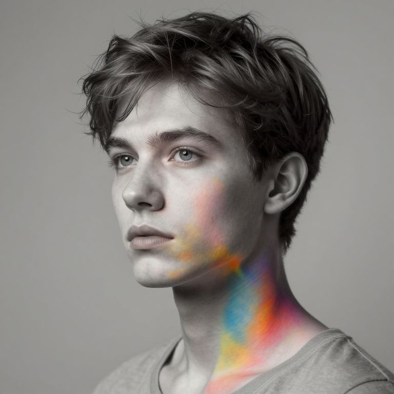 Photograph of a young, white male with short, tousled dark brown hair and light skin. His face is mostly in shadow with a bright, white highlight on his forehead and cheekbones. A vibrant, rainbow-colored light streaks across his chin and neck, contrasting with the gray background. He wears a simple, light gray t-shirt. The image has a modern, stylized look with high contrast and a slightly surreal effect, emphasizing the rainbow light against the monochromatic face. The subject's expression is neutral, gazing slightly to the right.