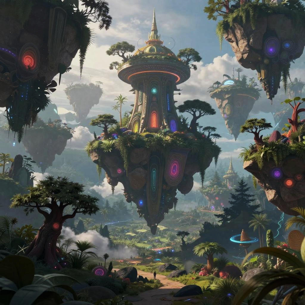 Fantasy CGI landscape with floating islands, towering spires, waterfall, glowing flowers, and lush greenery. Vibrant colors, serene waterway,
