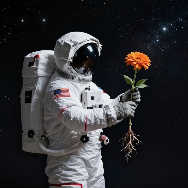 In the infinite expanse of cosmic silence, an astronaut cradles a vibrant flower, its roots entwined with earth and its petals reaching toward the stars, symbolizing the delicate yet resilient bridge between life and the unknown.