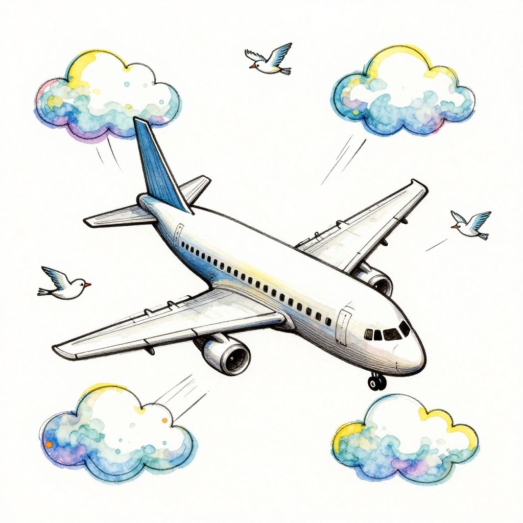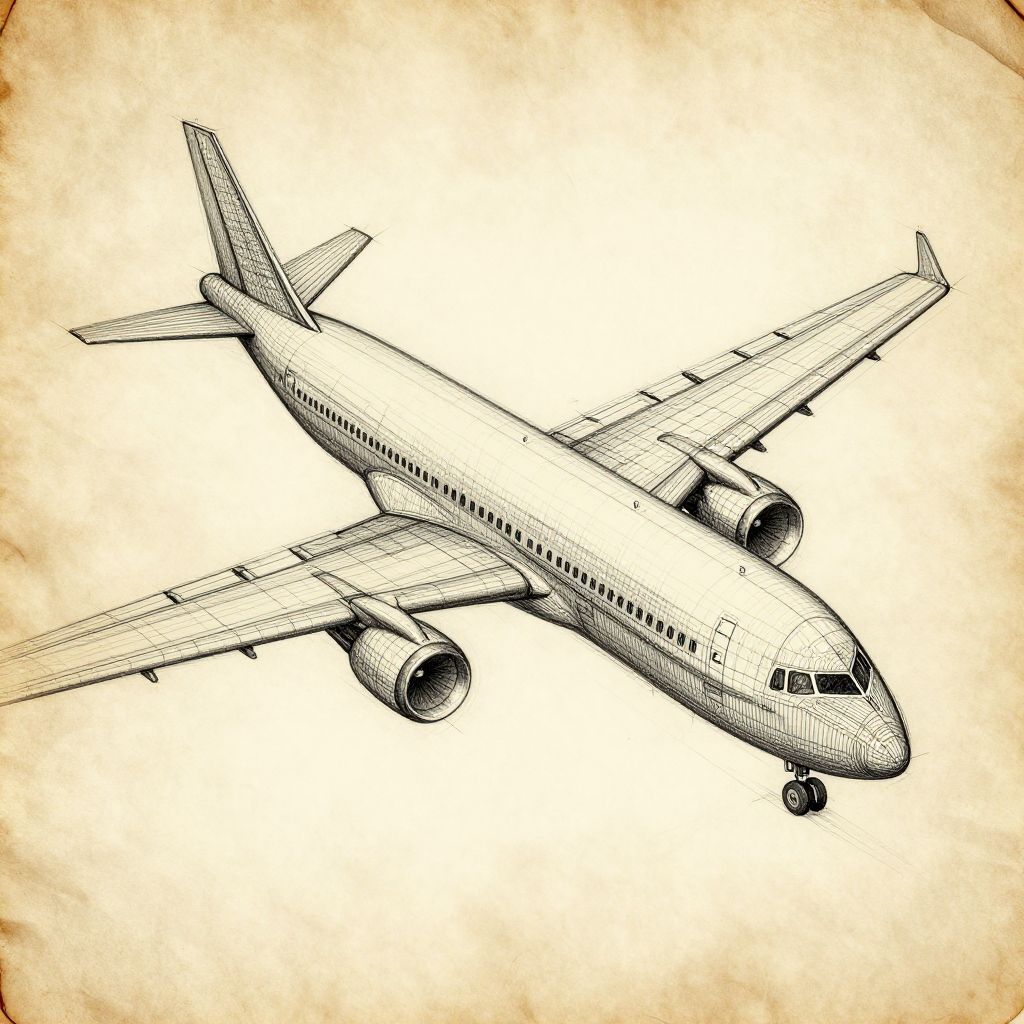 Detailed black-and-white pen sketch of a commercial airplane in flight, viewed from above, with textured beige background.