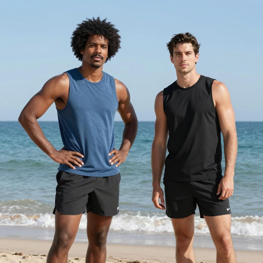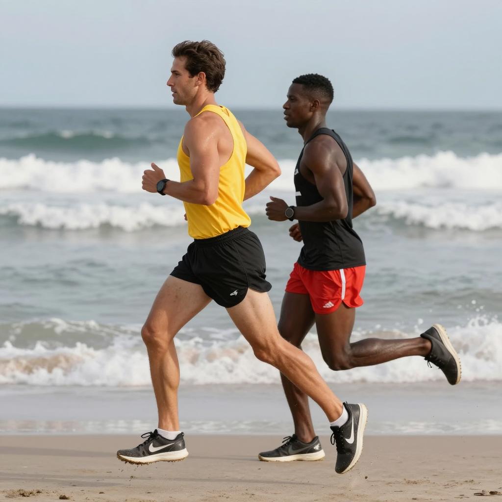 Photograph of two male runners on a beach. The white man with dark hair in a yellow tank top and black shorts leads, while the black man with short hair in a black tank top and red shorts trails behind. Both are muscular and mid-stride. Ocean waves in the background.