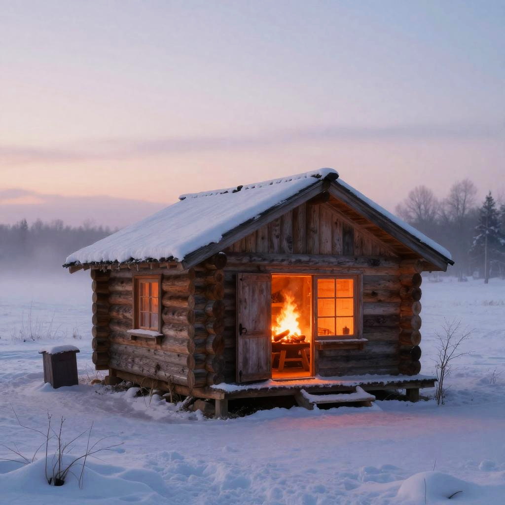 Photograph of a cozy wooden cabin in a snowy forest at twilight. The cabin has a steep, snow-covered roof, glowing yellow windows, and a small porch with a chair and table. Tall pine trees surround the cabin, their branches dusted with snow. The ground is blanketed in white snow, illuminated by the warm light from the windows. The sky above is a gradient of purple and blue, adding a serene, wintery atmosphere to the scene.