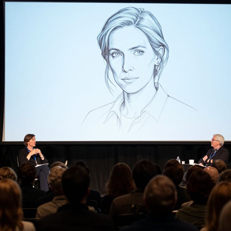 Photograph of a drawing on a large screen showing a detailed, monochromatic portrait of a smiling woman with short, wavy hair; two speakers