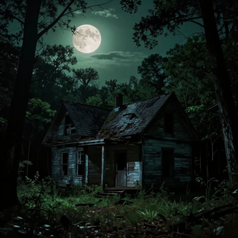 An eerie, abandoned cottage in the woods at night, illuminated by a full moon with a greenish hue, creating an unsettling atmosphere.