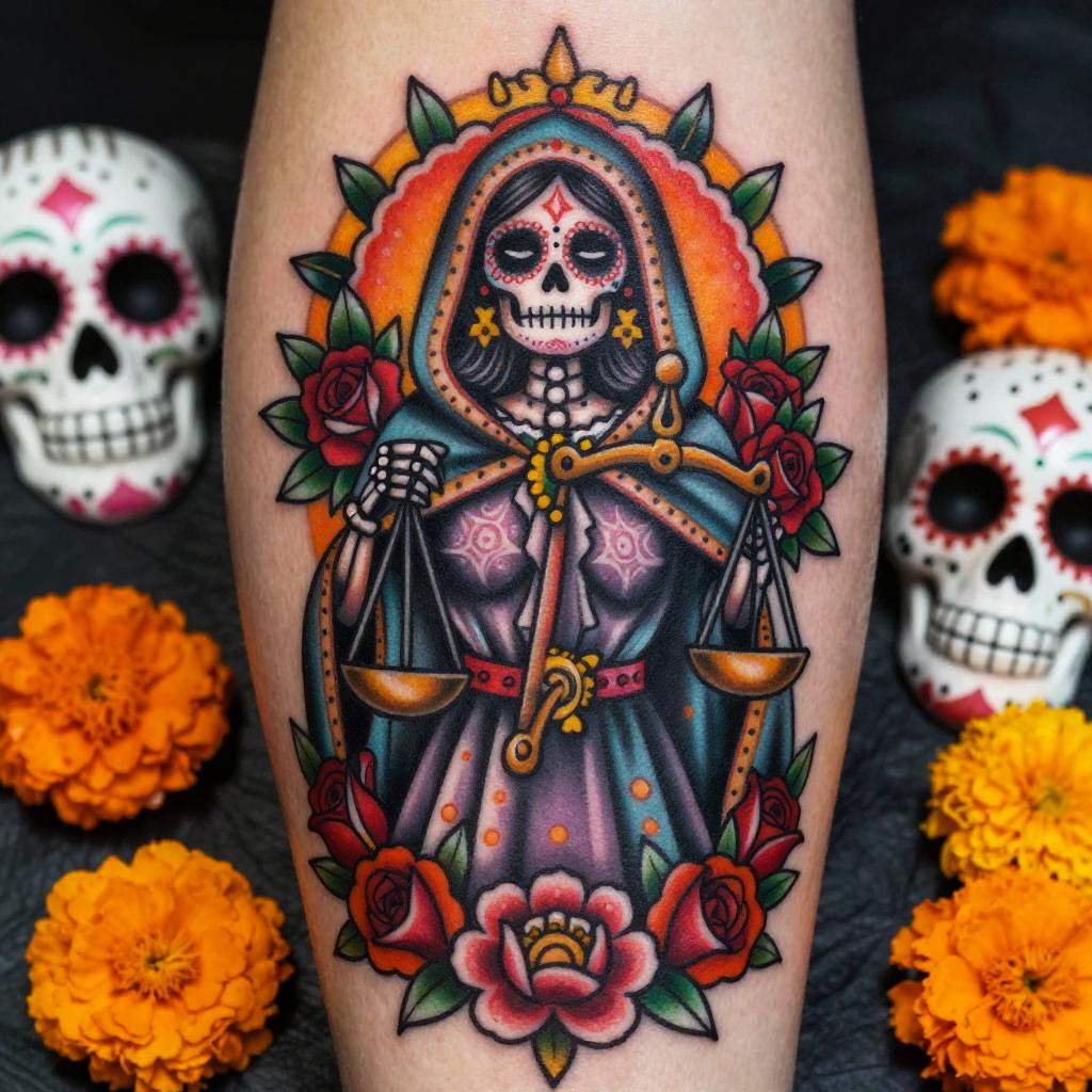 Santa Muerte tattoo art capturing the spiritual essence of the skeletal saint, decorated with elaborate Day of the Dead motifs, delicate lace patterns on the robe, sacred geometrical shapes, and warm candlelight illuminating the figure in a dramatic composition.