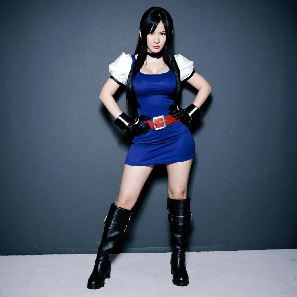 Tifa lockhart cosplay,1girl, solo, black hair, gloves, long hair, boots, dress, fingerless gloves, lips, standing, belt