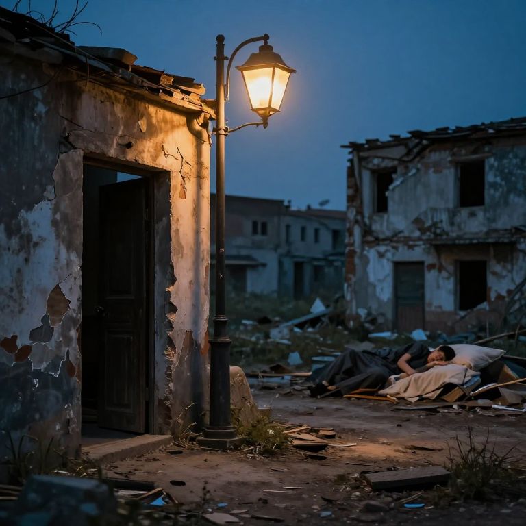 A streetlamp flickers beside an open door into perpetual twilight, where crumbling cities sleep timelessly.