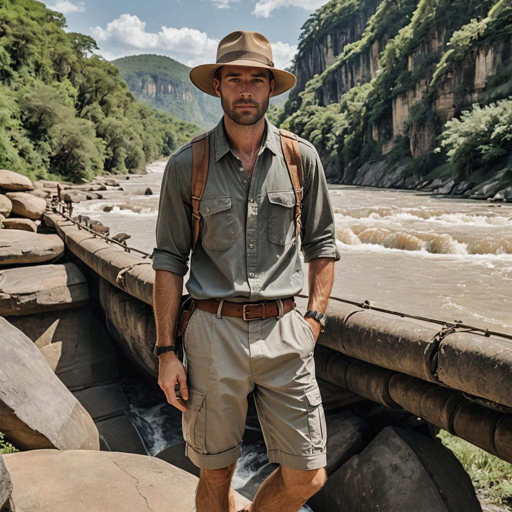 Man in Safari Outfit by River and Cliffs