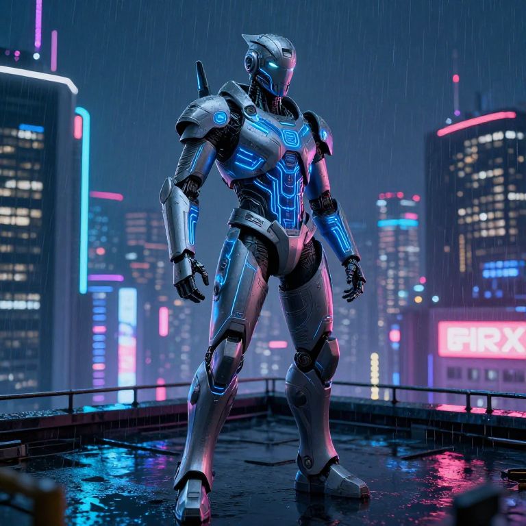Sherox, a futuristic cybernetic warrior standing on a neon-lit rooftop in a sprawling metropolis at night, detailed armor with glowing blue circuits, rain gently falling, vibrant reflections on wet surfaces, cinematic perspective, high detail, dynamic lighting.