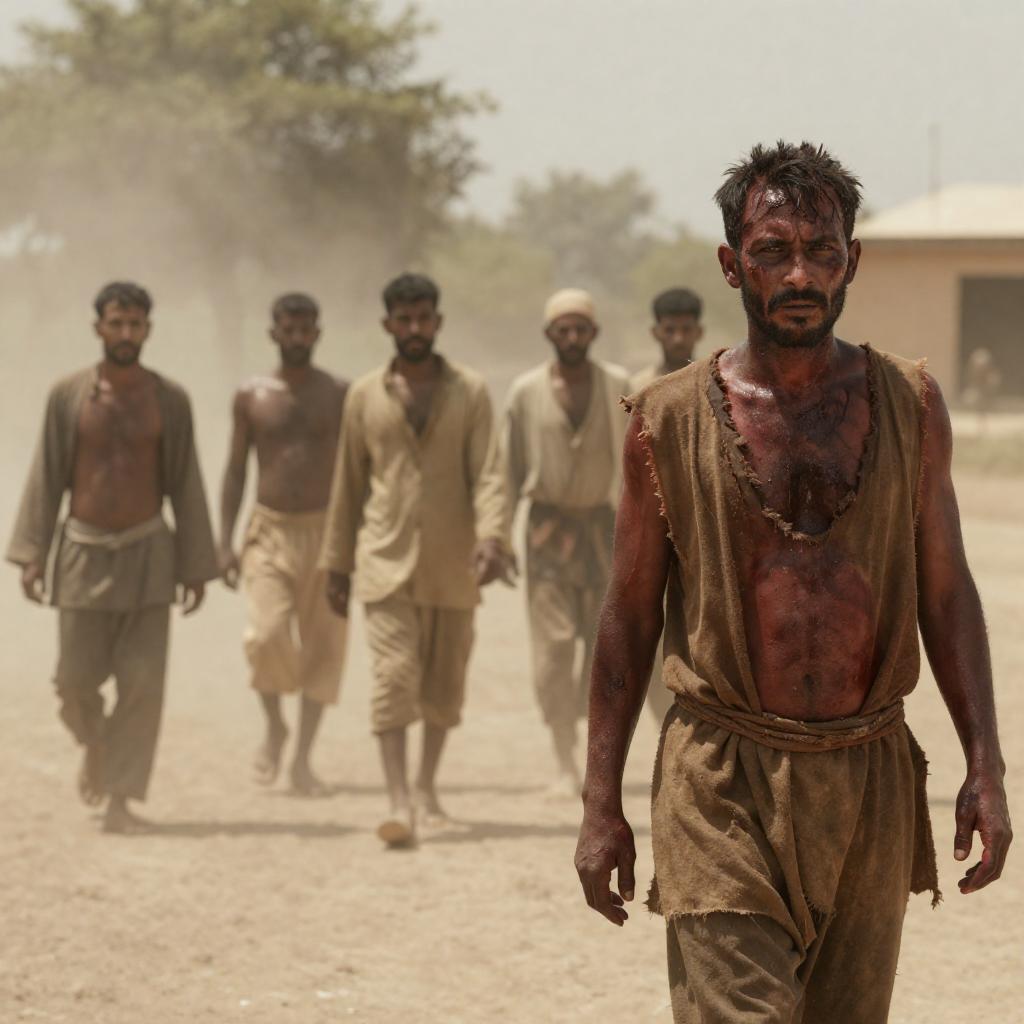 Man walking through yellow-tinted desert, wearing loose shirt and pants, carrying a suitcase in right hand, holding a stick in left hand. Dry bushes and grass in foreground, endless desert landscape in background. Intense, determined facial expression.