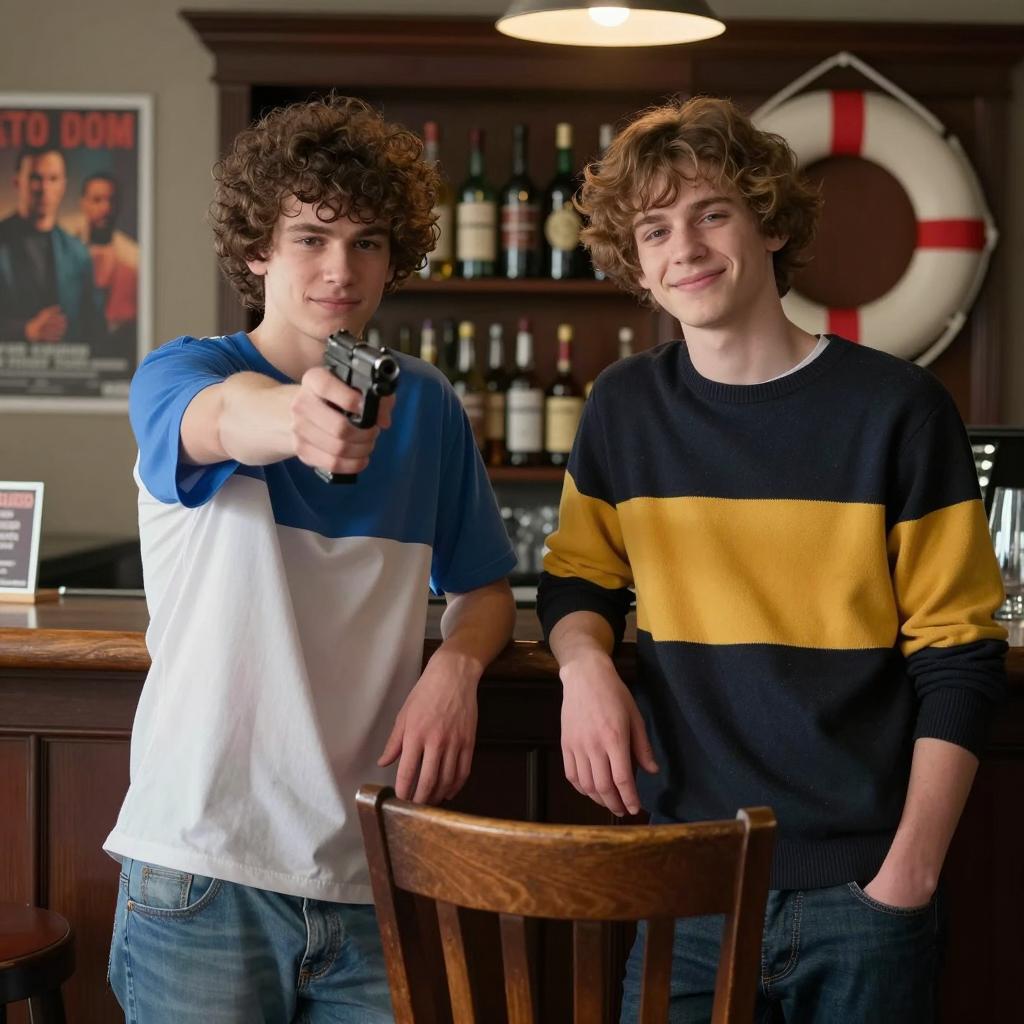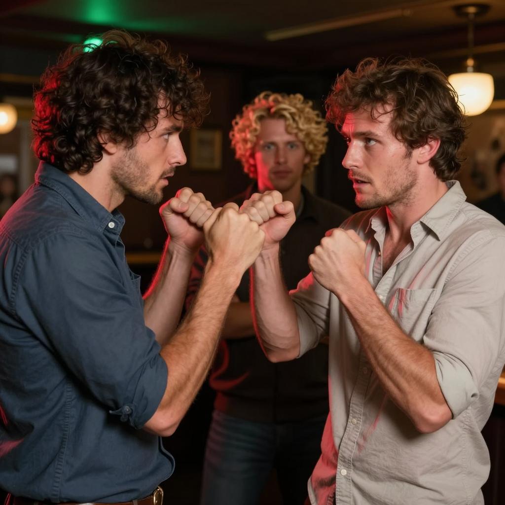 Muscular man in red tank top and shorts grabs throat of younger man in white shirt and red vest, in a cluttered room with patterned wallpaper, kitchen counter, and shelves. Both men have intense expressions. Two people, indoor setting.