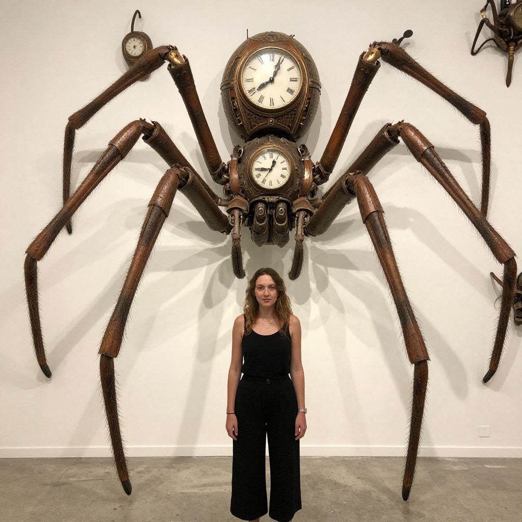 A woman stands before a wall adorned with colossal, mechanical spiders whose bodies are intricately woven with golden clocks, defying the boundaries between time, art, and the animate world.