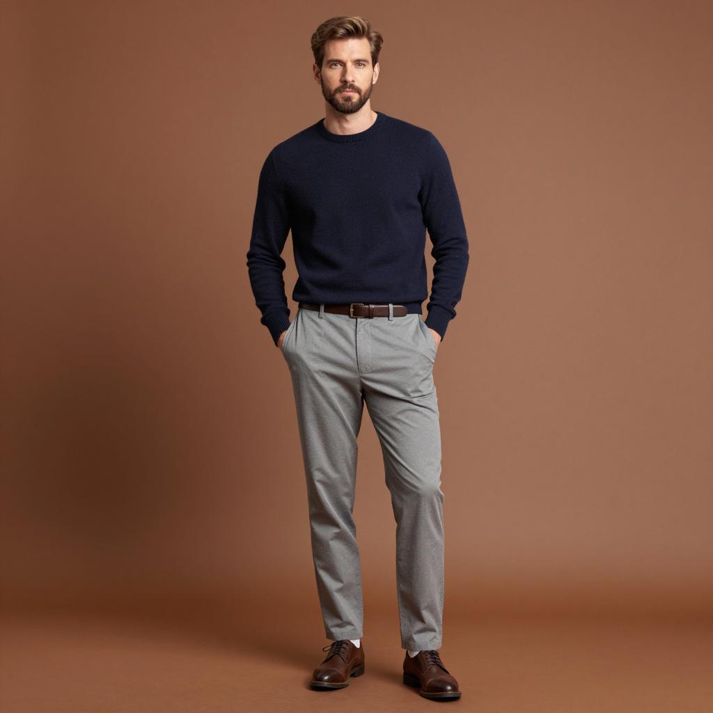 Stylish male costume, photograph of a handsome bearded man, standing in front of an arched stone building, wearing a long dark blue coat, beige sweater, brown scarf, brown pants with orange belt, black boots, hands in pockets, daytime, soft lighting, streetlamp on the left, plant in the background, urban setting, stylish, fashionable, autumn/winter outfit, medium shot, slightly posed, natural colors, realistic style