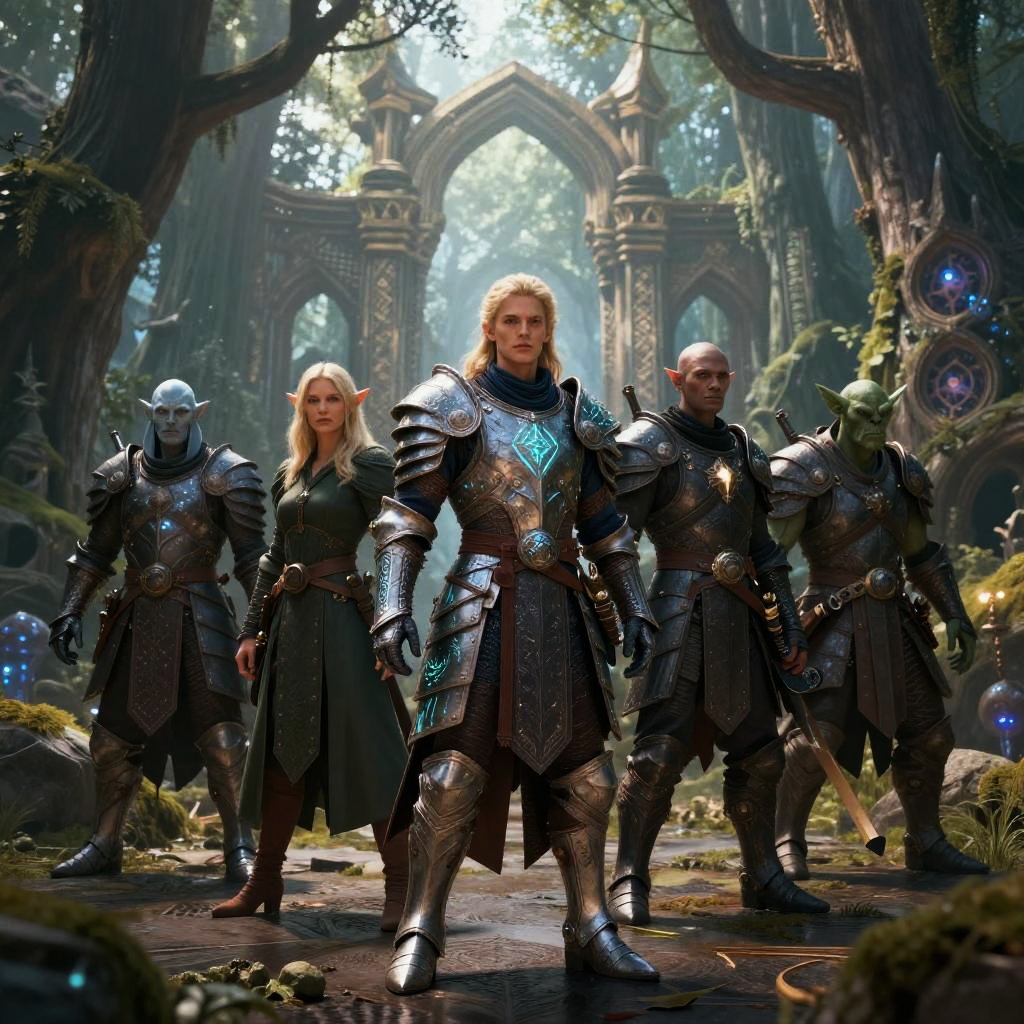 Midjourney DnD characters portrayed as a heroic party, each with unique class traits: warrior, mage, rogue, cleric, detailed costume design, fantasy backdrop with castles and dragons, bright and vivid magical effects, epic and inspiring composition full of adventure.