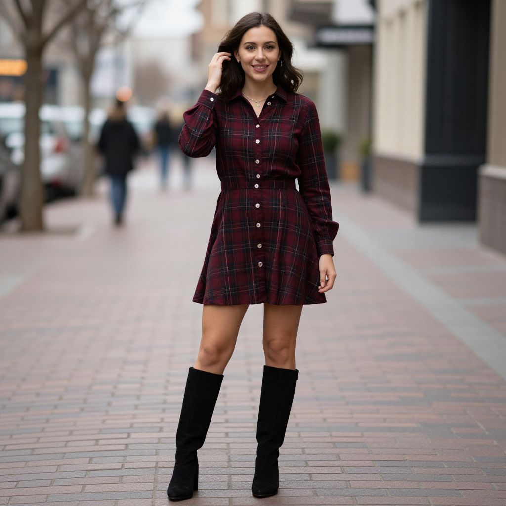 Smiling woman wearing a dark red plaid dress stands confidently on a brick-paved street, her hand gently adjusting her hair while showcasing the outfit's buttoned front and knee-high boots.