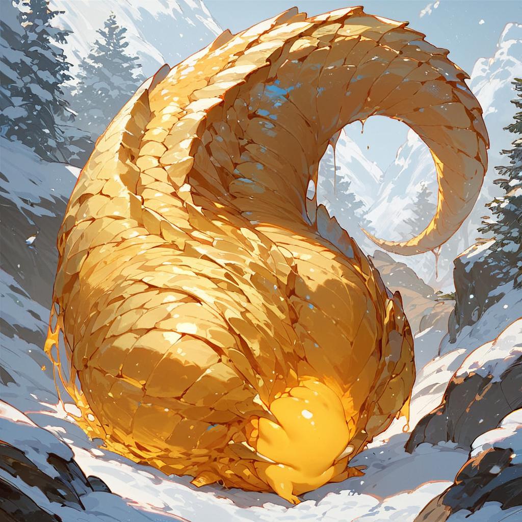 Score_9, score_8_up, source_anime, (((Full yellow creature))) wild, huge golden creature, snow, golden scales, gold, yellow