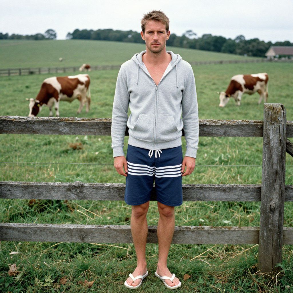 A man, lightweight grey zip-up hoodie, navy striped boardshorts, classic white flip-flops, vibrant green pastures, grazing cows, rustic wooden fence, eastman film stock, relaxed expression Man has masculine face and piercing eyes