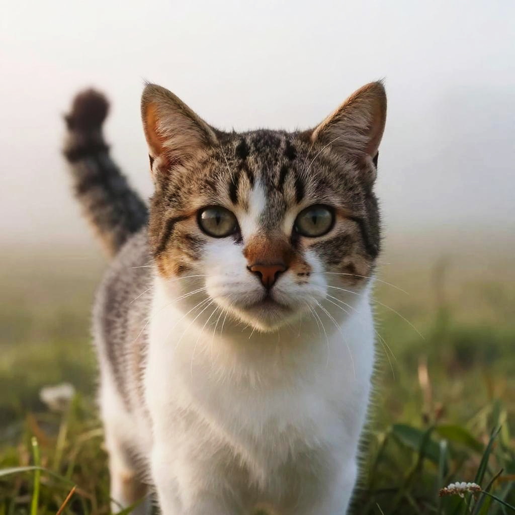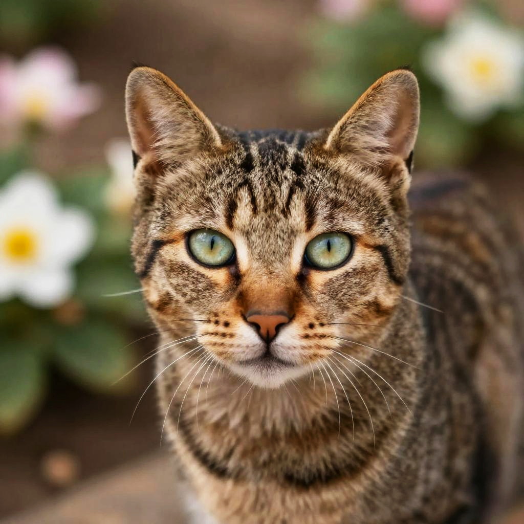 Close-up portrait of a tawny tabby cat with striking green eyes, intricate fur patterns, soft blurred garden background with blooming flowers, warm tones