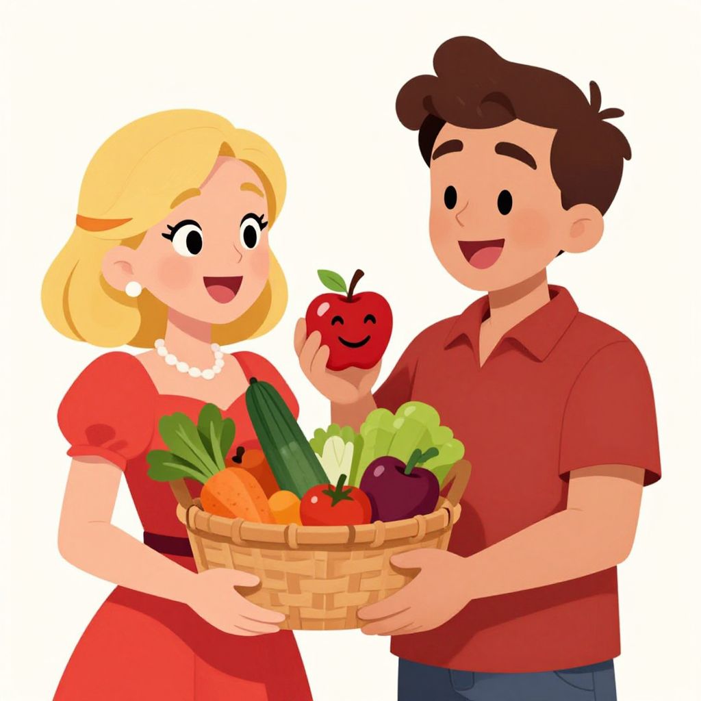 Two animated characters, a woman with blonde hair wearing a red dress and a man with brown hair in a red shirt, share a joyful moment as they hold a basket of fresh vegetables and a smiling apple, symbolizing a collaborative and fun approach to healthy eating.