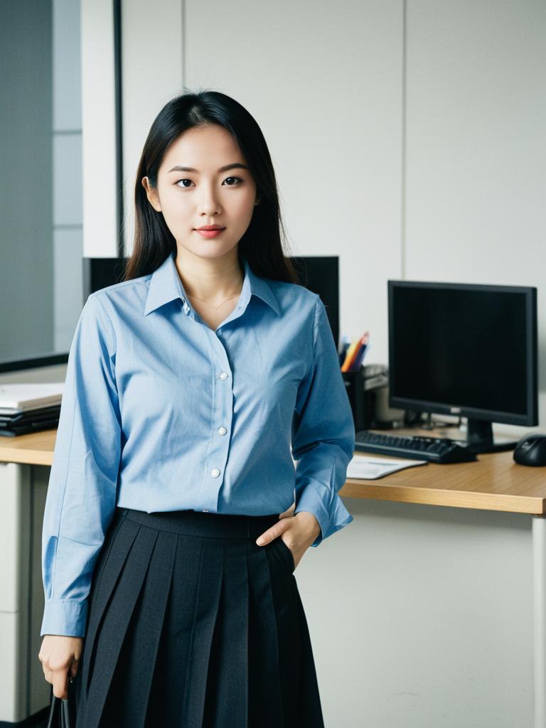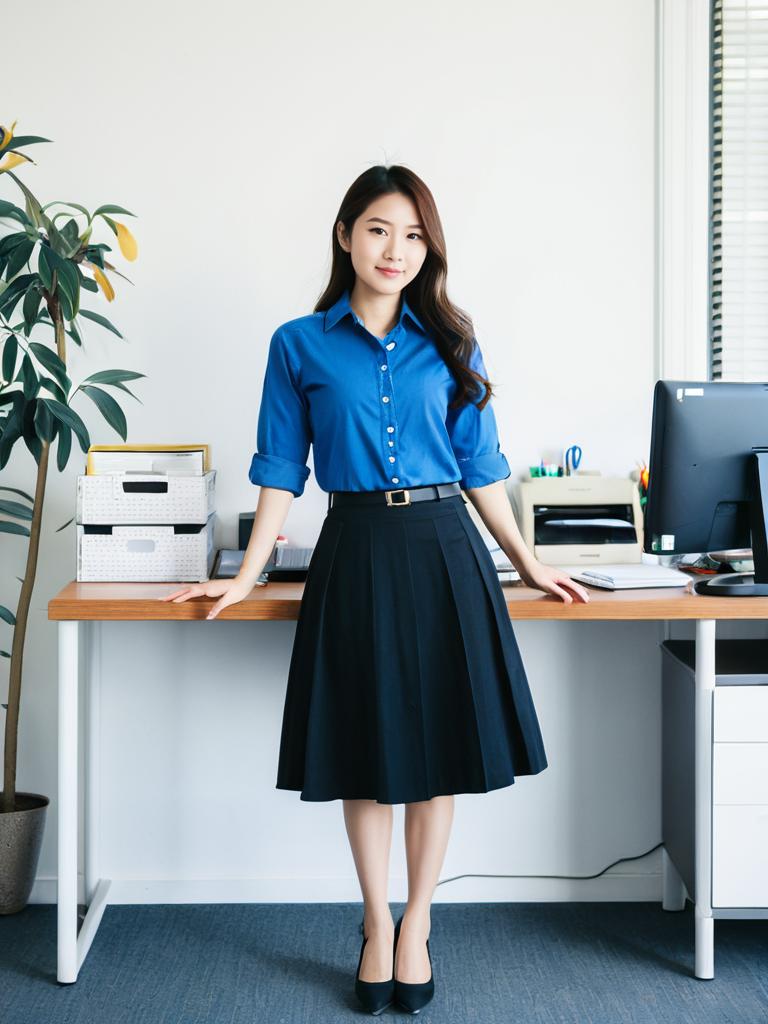 Casual Korean Office Wear, asian woman in a blue shirt and black skirt standing in an office --sref 1388