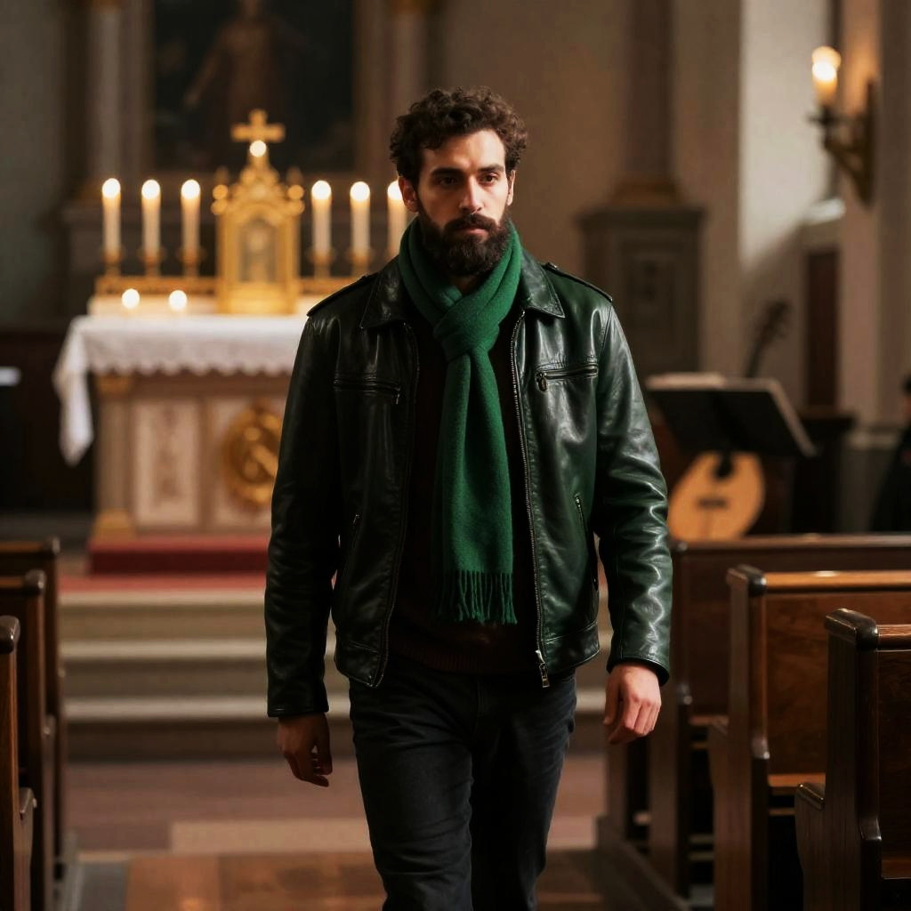 A bearded man with dark curly hair walks through a dimly lit church aisle. He wears a dark green leather jacket and a matching green scarf, paired with dark pants. The background features a candlelit altar with religious symbols, wooden pews, and musical instruments, creating a warm and serene atmosphere.