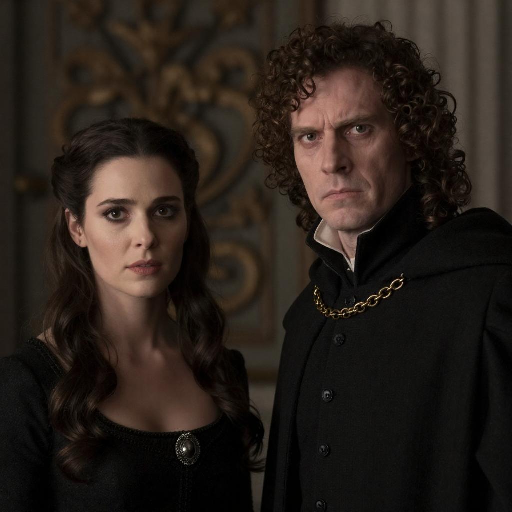 Photograph of two people in a historical setting. A man with long dark hair, wearing a brown vest and white shirt, faces a woman with long brown hair, wearing a red coat and white dress. They stand close, looking at each other with intense expressions. Background has blue and white light rays.