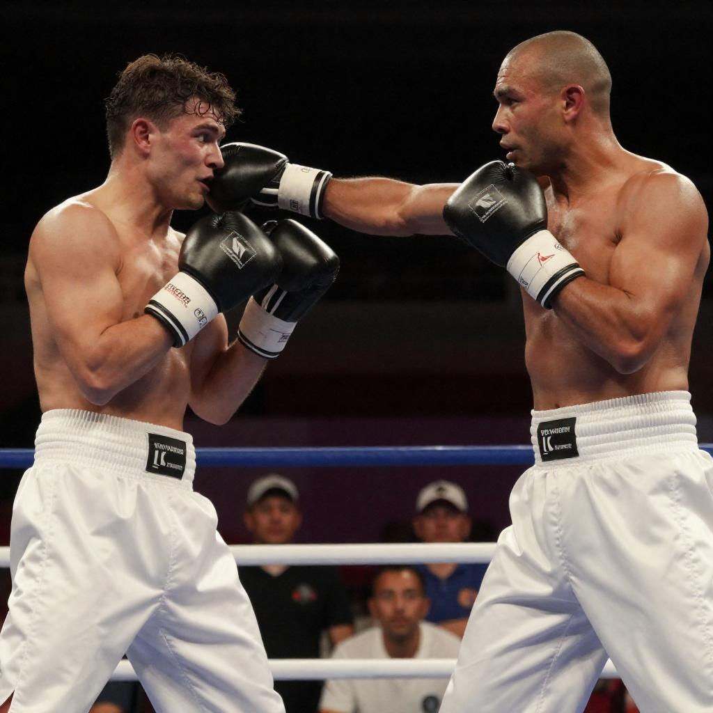 Photograph of two male shirtless boxers in white pants and black boxing gloves engaged in an intense fight inside a boxing ring. One boxer with curly hair is receiving a punch from the other bald, muscular boxer. Several spectators are visible in the dimly lit background.