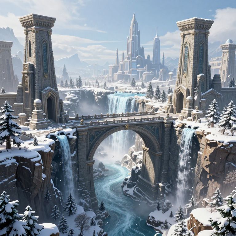 A 3D-rendered fantasy landscape features a majestic stone bridge spanning a chasm, connecting grandiose architectural structures reminiscent of ancient ruins on one side and futuristic cityscapes on the other, all enveloped in a serene winter wonderland with cascading waterfalls and dramatic lighting effects.