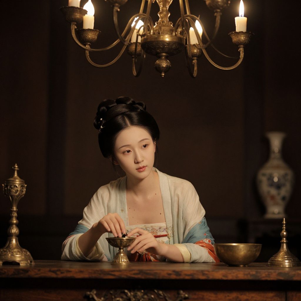 Photograph of an East Asian woman with fair skin and black hair styled in an intricate updo, sitting at a wooden table in a dimly lit room. She wears a traditional, pale blue and white kimono with a red pattern. Above her, a brass chandelier with lit candles casts a warm glow. On the table are a small brass bowl, a silver candelabrum with an unlit candle, and a decorative vase with floral patterns in the background. Her expression is calm and contemplative as she holds a small, delicate object in her hand. The overall atmosphere is serene and vintage.
