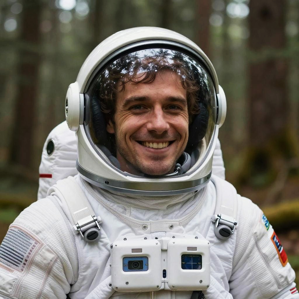 Comic artwork of space explorer, portrait, smiling, happy, forest background, overcast diffused light, crosshatching, 2D, Sharp, Detailed, HD, HDR, High Quality, High Resolution, Masterpiece