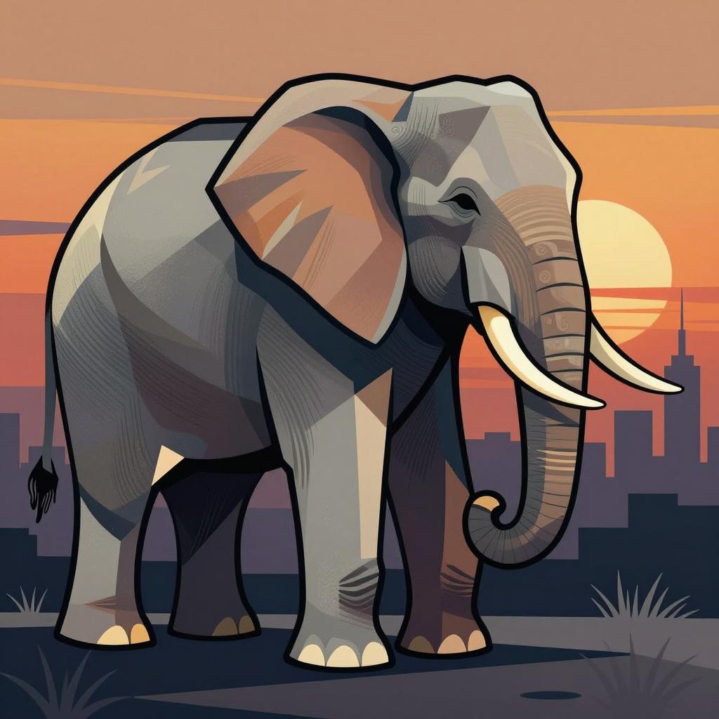 Elephant illustration in Cubism style, featuring sleek lines, geometric shapes, and a rich color palette against a bright sunset with city skyline silhouettes, inspired by Art Deco masters –ar 1:1 –q 2 –stylize 100