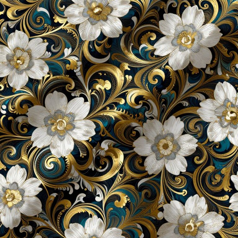 Smart Fabrics a beautiful gold swirl floral design with white flowers, in the style of dark matter art, dark white and dark cyan, net art, dark white and light gold, 32k uhd, sgrafitto, beautiful,