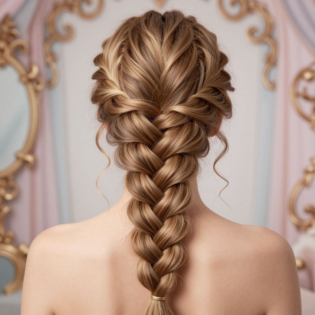 Photograph of a woman's back, showcasing a detailed, long braided hairstyle with intricate twists and curls. Her light brown hair is glossy and smooth, with a thick braid cascading down her back. She is bare-shouldered, suggesting she might be wearing a strapless top or dress. The background features an ornate, golden-framed mirror with pastel pink and blue drapes, adding a whimsical, fairy-tale-like atmosphere to the image. The lighting highlights the texture and shine of her hair, making it the focal point of the composition.