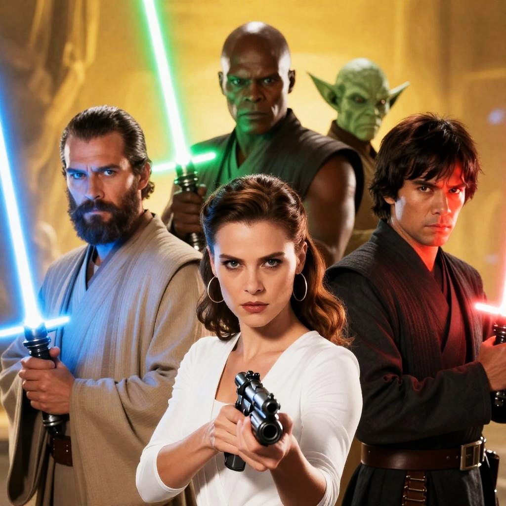 Photograph of Star Wars characters in action pose. Front: woman with brown hair, hoop earrings, white top, holding blaster, serious expression. Left: man with beard, light robe, blue lightsaber, intense gaze. Right: man with dark hair, dark robe, determined expression. Background: bald man with brown skin, green lightsaber, focused expression; green-skinned character with pointy ears, alert expression. Yellowish, glowing background. Bright lightsabers.