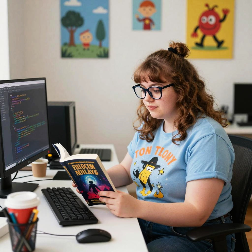 Chubby nerdy women sitting at a computer desk, wearing quirky graphic tees and oversized glasses, immersed in coding and science fiction novels, with cluttered workspace and bright, playful colors, digital art style.
