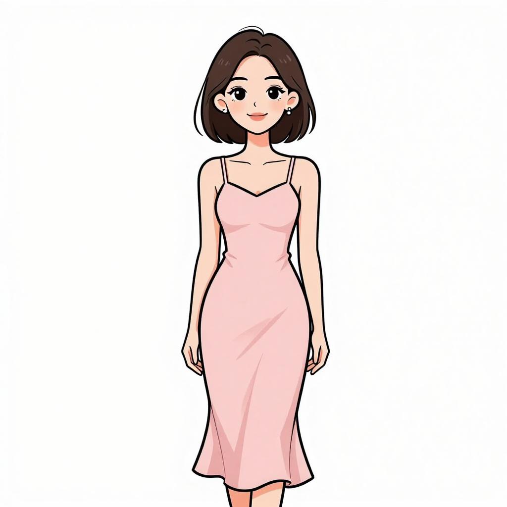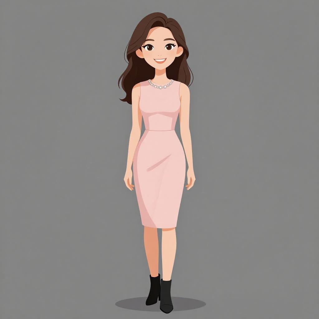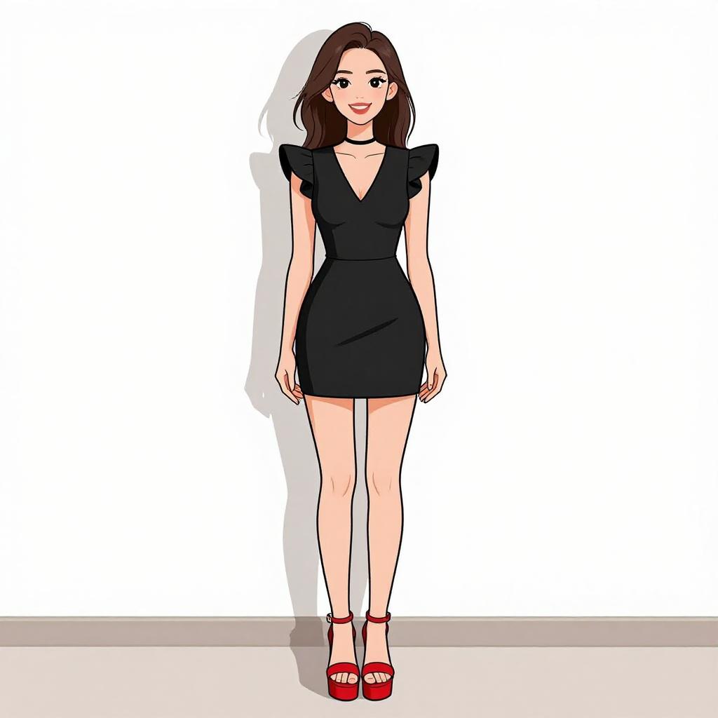 Woman with pretty face and pretty hair. smiling Woman, minimalist, black sleeveless maxi dress with a scoop neckline, fitted silhouette, thin straps, plain design, black platform sandals with white soles, straight long hair with bangs, gray studio background. --sref 1467
