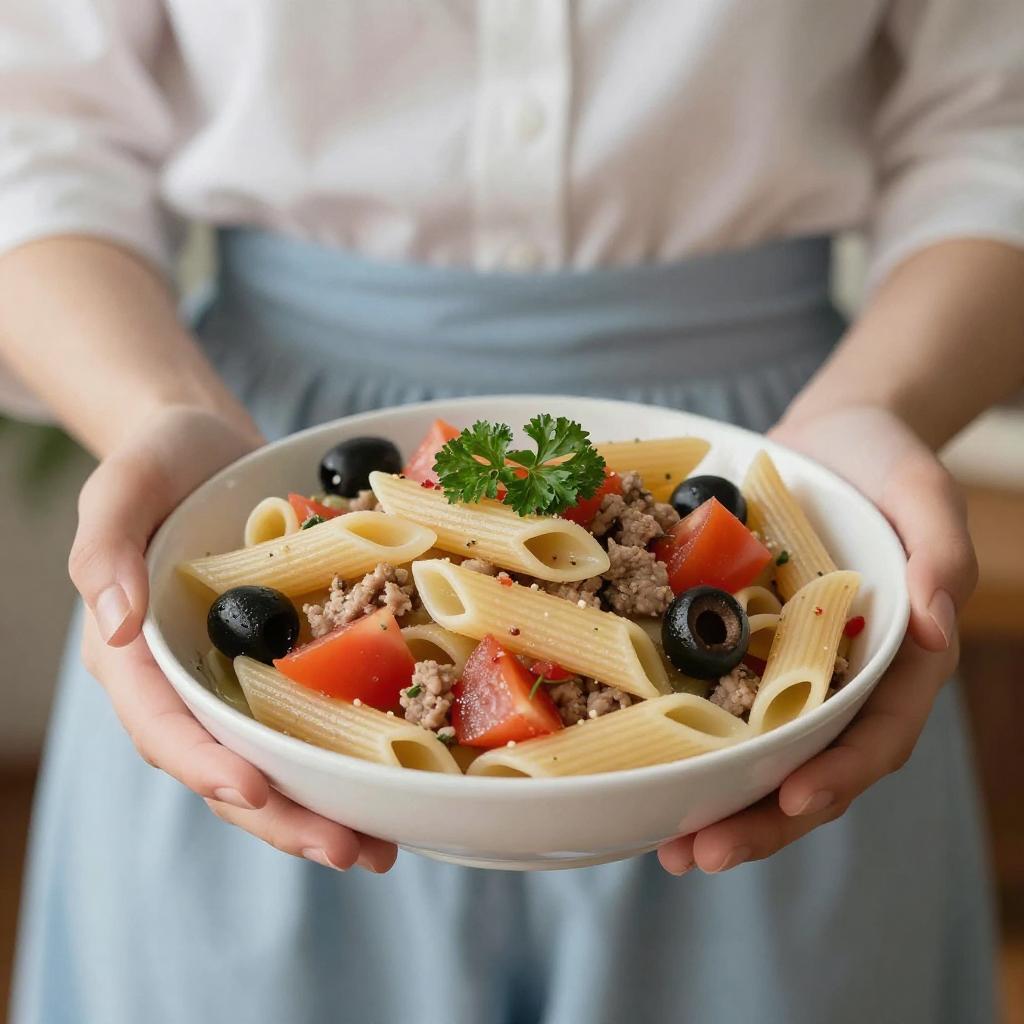 Photograph of a person holding a white bowl filled with penne pasta salad. The salad includes chunks of tomato, black olives, and bits of meat, topped with parsley. The person is wearing a white shirt and light blue skirt, visible from the waist up. The background is softly blurred, and the lighting is natural, coming from the front. The camera angle is slightly low, with a shallow depth of field focusing on the salad.