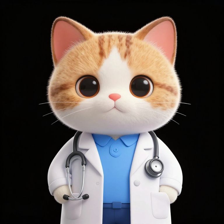 Digital artwork of an anthropomorphic, orange and white cat with large, round black eyes and a pink nose, wearing a white doctor's coat over a blue shirt. A black stethoscope hangs around its neck. The cat's fur is fluffy, and its ears are pink on the inside. The background is solid black, making the cat and its medical attire stand out prominently. The cat's expression is neutral and slightly serious. The style is cartoon-like and highly detailed, with a focus on a cute, yet professional appearance.