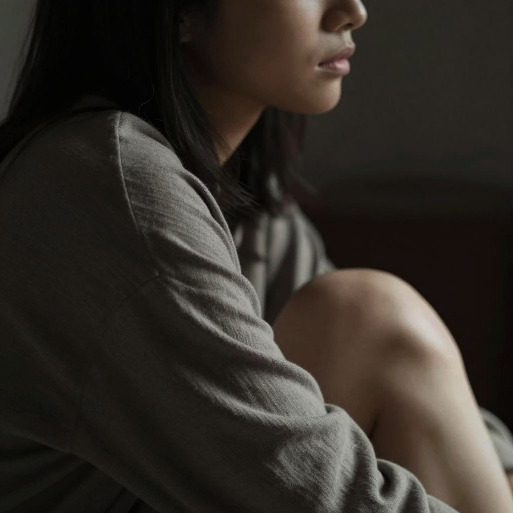 A close-up photograph of a person in profile, partially illuminated by soft light. They're wearing a loose, grayish-brown shirt that drapes over their shoulder, revealing a glimpse of their bare thigh. The background is dark and blurred, creating a moody, intimate atmosphere. The lighting highlights the contours of their face and the fabric's texture. The overall composition feels contemplative and quiet.